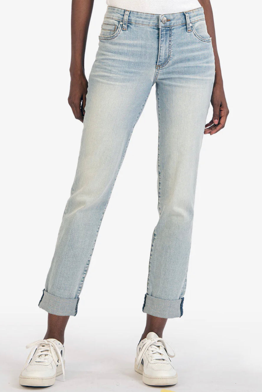 - Enjoy casual weekends in these stretchy, mid-rise boyfriend jeans made with full-length legs that can be cuffed for a polished finish.