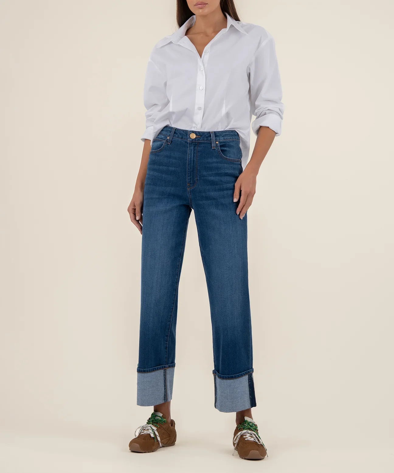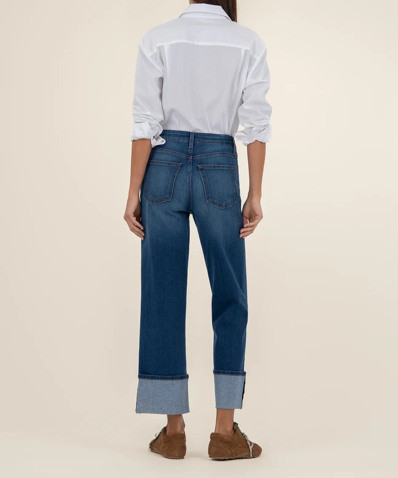 - Step into comfort with these high-rise straight leg jeans featuring a roomy fit and stylish wide roll-up cuffs. Crafted in a classic dark wash with stretchy material, they offer effortless style and all-day ease. Perfect for a laid-back yet polished look.